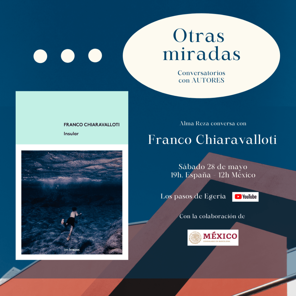 28 de mayo, 2022 19h España – 12h MĂ©xico. Conversatorio con Franco Chiaravalloti sobre su libro de relatos Insular (Ed. Tres hermanas) – TransmisiĂ³n por el canal youtube Los pasos de Egeria