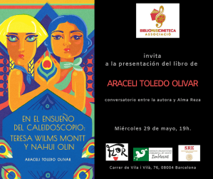 - 29 de mayo Presentación del libro En el ensueño del caleidoscopio: Teresa Wilms Montt y Nahui Olin de Araceli Toledo Olivar (profesora de la Universidad de Puebla). Bibliomusicineteca. 19h